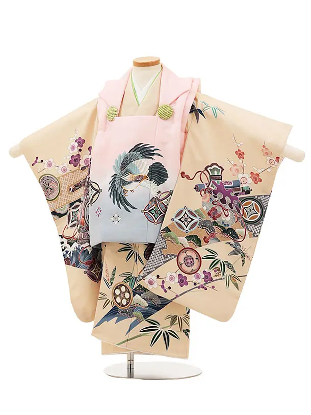 七五三レンタル(2歳男児被布)W139ピンク鷹xクリームベージュ波に吉祥文様