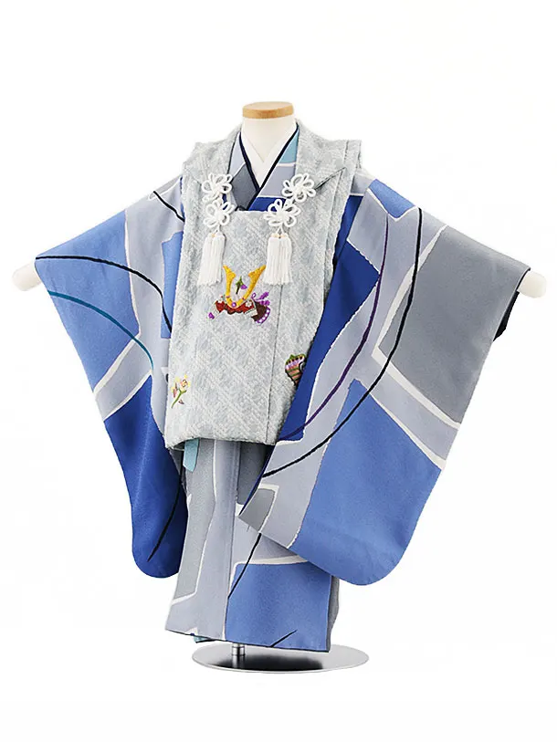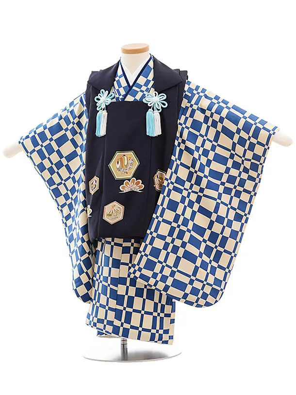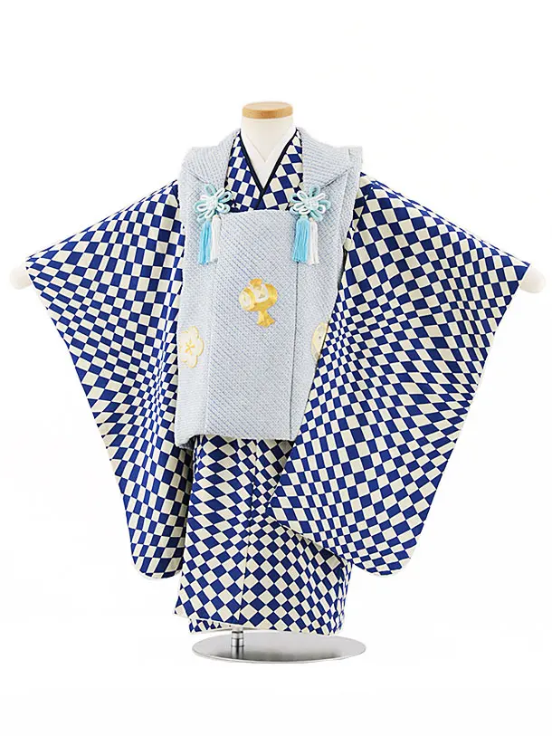 七五三(3歳男児被布)W549【正絹】ブルーグレー刺繍小槌×紺地変わり市松