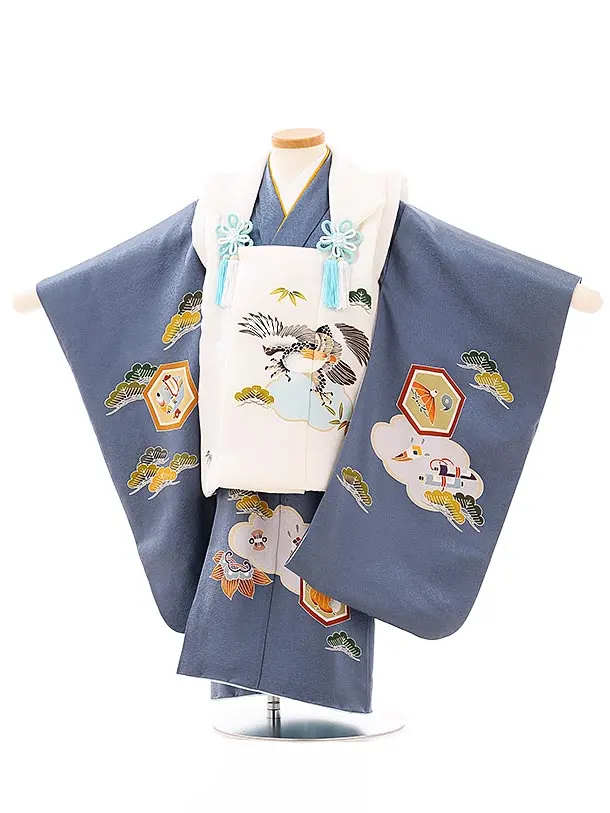 七五三レンタル(3歳男児被布)W201【正絹】グレー刺繍松竹×紺地梅