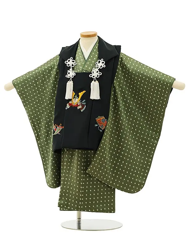 七五三レンタル(3歳男児被布)W562【正絹】ベージュ刺繍兜×ヒワ色 吉祥文様