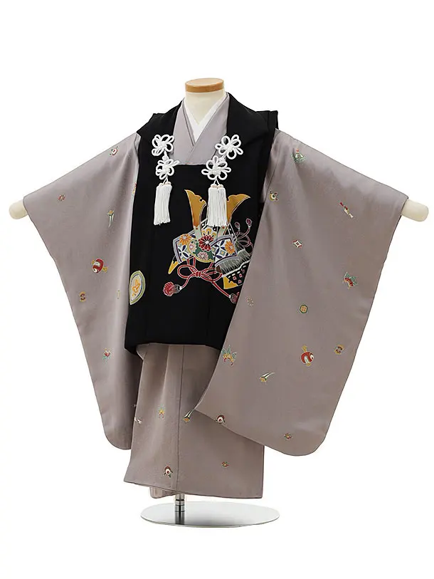 七五三(3歳男児被布)2961【正絹】黒兜×グレージュ吉祥文様