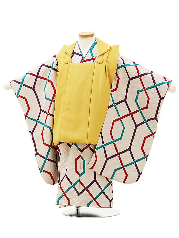 七五三レンタル(3歳男児被布)W020【正絹】からし色xグレージュ幾何学