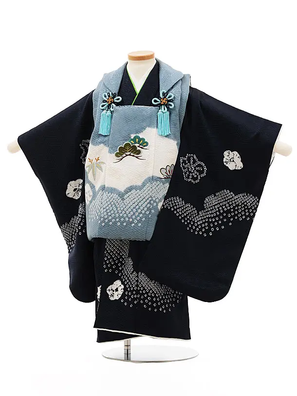七五三レンタル(3歳男児被布)W559【正絹】黒疋田柄 刺繍小槌×紺地ドット