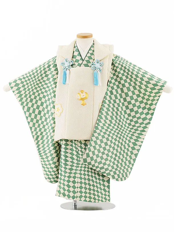七五三レンタル(3歳男児被布)W550【正絹】ヒワ色×ブルーグレーチェック