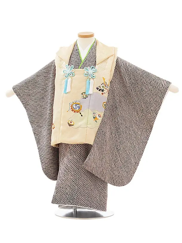 七五三(3歳男児被布)2959【正絹】黒小槌吉祥文様×グレージュ小紋