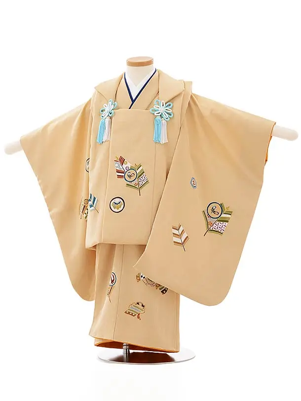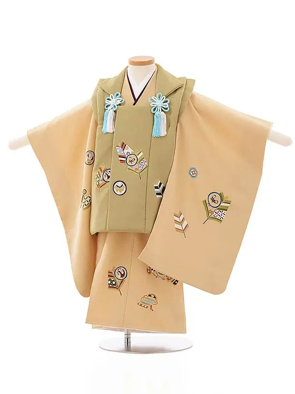 七五三レンタル(3歳男児被布)W562【正絹】ベージュ刺繍兜×ヒワ色 吉祥文様