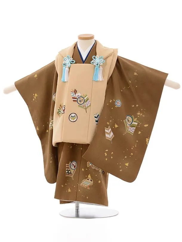 七五三(3歳男児被布)高級正絹2619ベージュ地吉祥文様x紺赤絞り