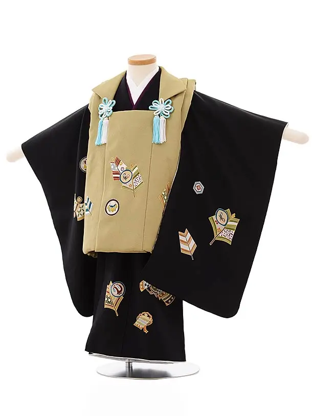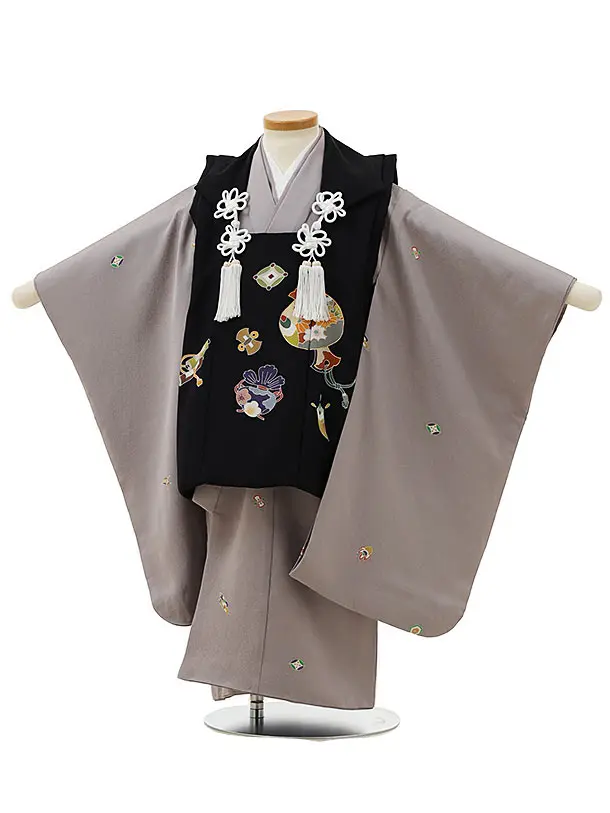 七五三(3歳男児被布)2961【正絹】黒兜×グレージュ吉祥文様