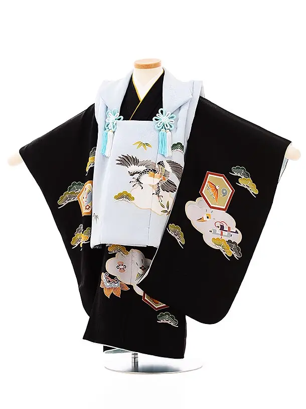 七五三レンタル(3歳男児被布)2664高級正絹 水色鷹x黒地宝尽し