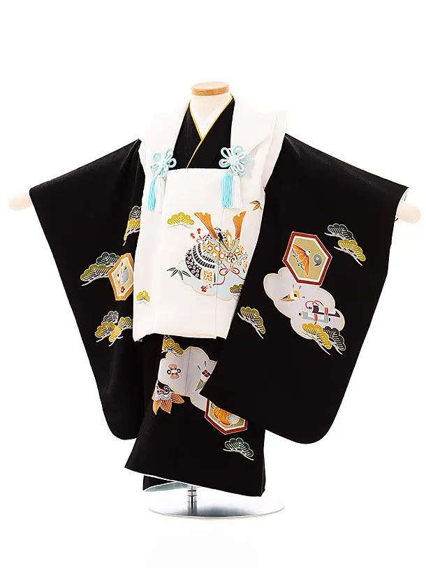 七五三レンタル(3歳男児被布)W584【正絹】黒絞り金コマ×白 吉祥文様