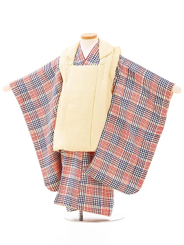 七五三レンタル(3歳男児被布)2683高級正絹クリーム色xベージュ手描格子