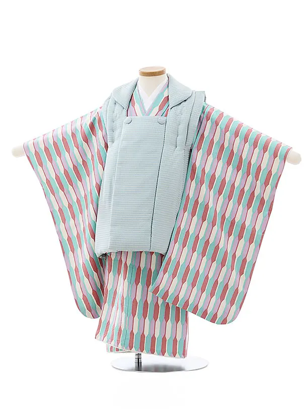 七五三レンタル(3歳男児被布)2729【正絹】水色x白ピンクグリーン変わり柄