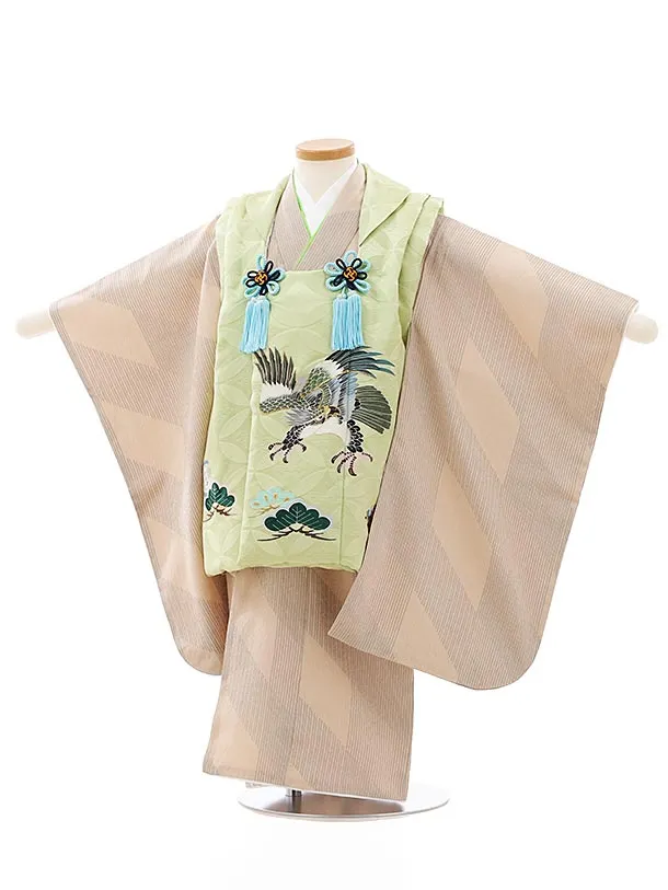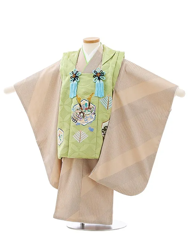 七五三レンタル(3歳男児被布)2738【正絹】ひわ色兜×ベージュ斜縞