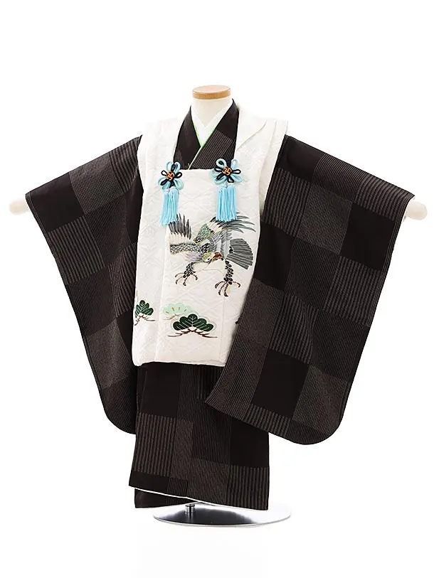 七五三レンタル(3歳男児被布)2742【正絹】ホワイト地松鷹×こげ茶色市松