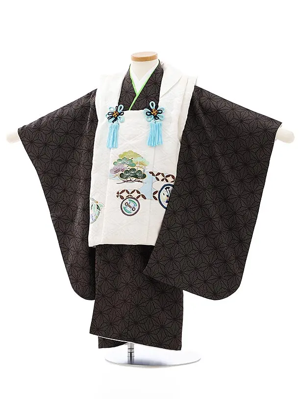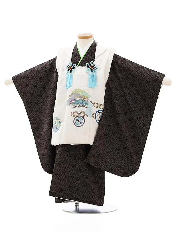七五三レンタル(3歳男児被布)2745【正絹】ホワイト地松×こげ茶色麻の葉