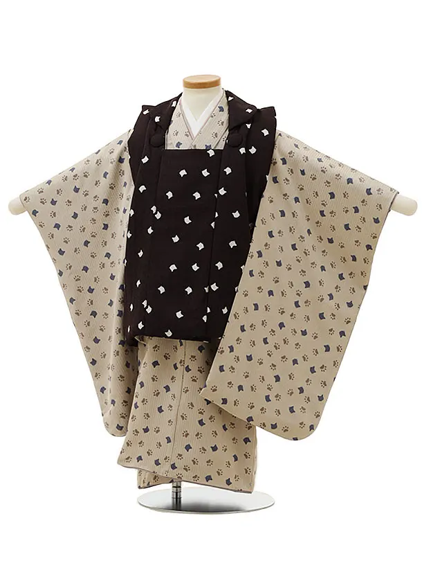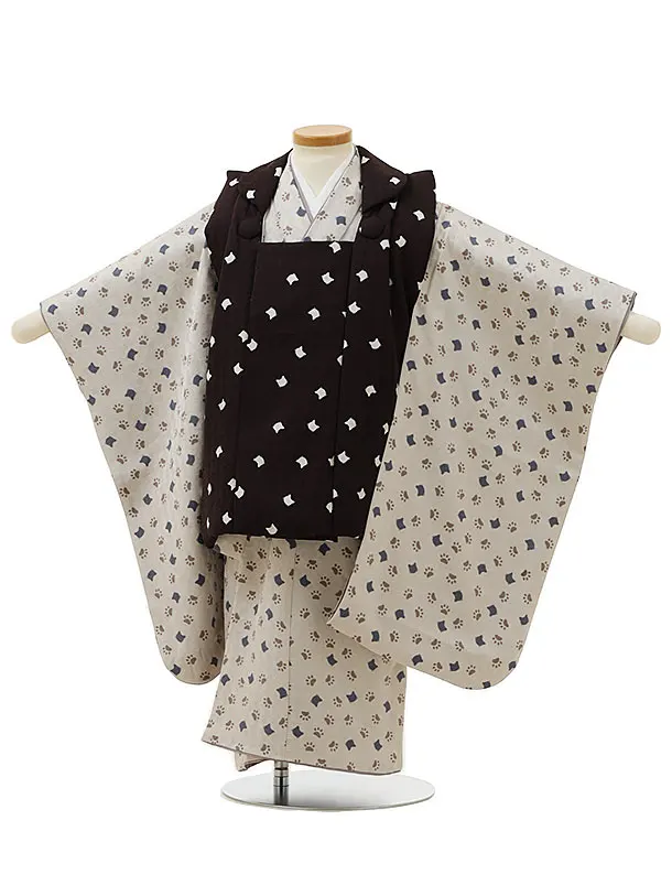 七五三(3歳男児被布)2949【正絹】こげ茶×ベージュ猫