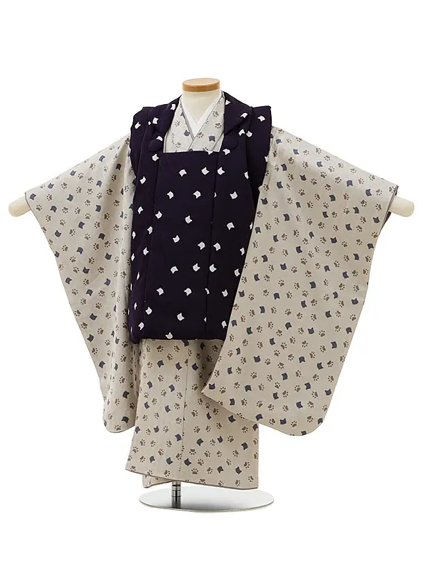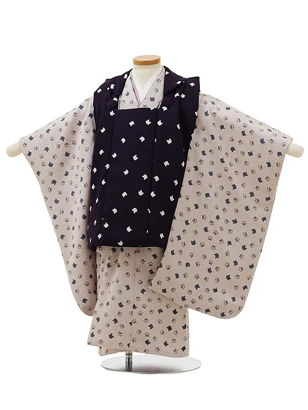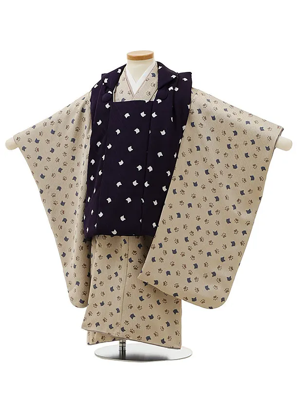 七五三(3歳男児被布)2950【正絹】パープル×ベージュ猫