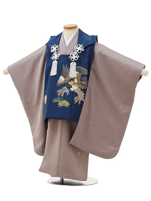 七五三レンタル(3歳男児被布)2668高級正絹 うす茶鷹x紺地宝尽し