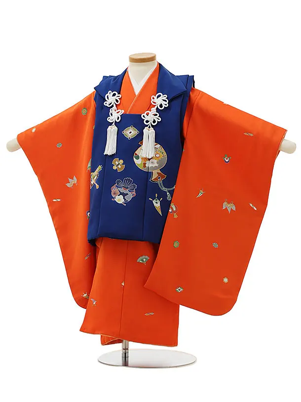 七五三(3歳男児被布)2954【正絹】ブルー小槌吉祥文様×オレンジ吉祥文様