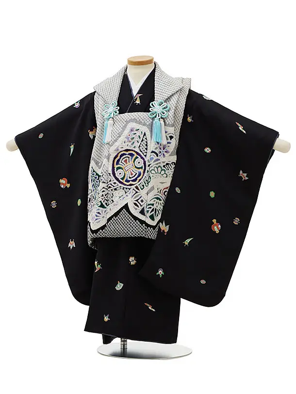 七五三レンタル(3歳男児被布)2665高級正絹 白地兜x黒地宝尽し