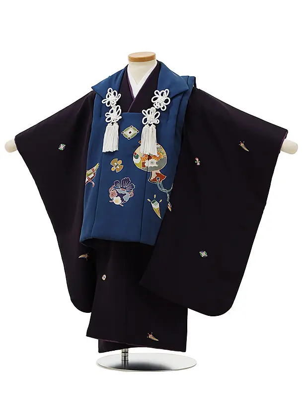 七五三(3歳男児被布)2957【正絹】ブルー小槌吉祥文様×濃パープル小紋