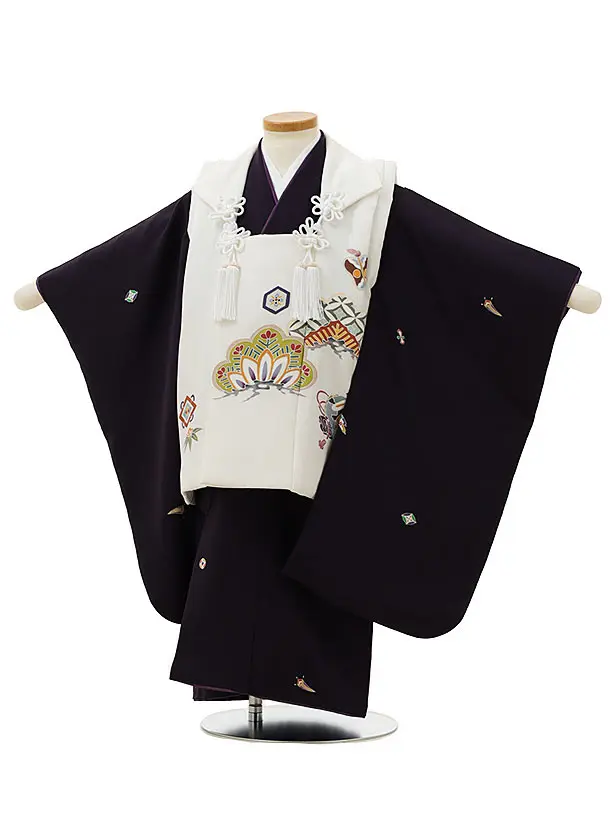 七五三(3歳男児被布)2958【正絹】白地松吉祥文様×濃パープル小紋