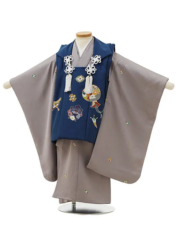 七五三レンタル(3歳男児被布)W201【正絹】グレー刺繍松竹×紺地梅