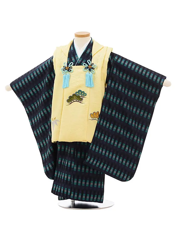 七五三(3歳男児被布)高級正絹2580薄黄色刺繍松笹x紺よろけ織