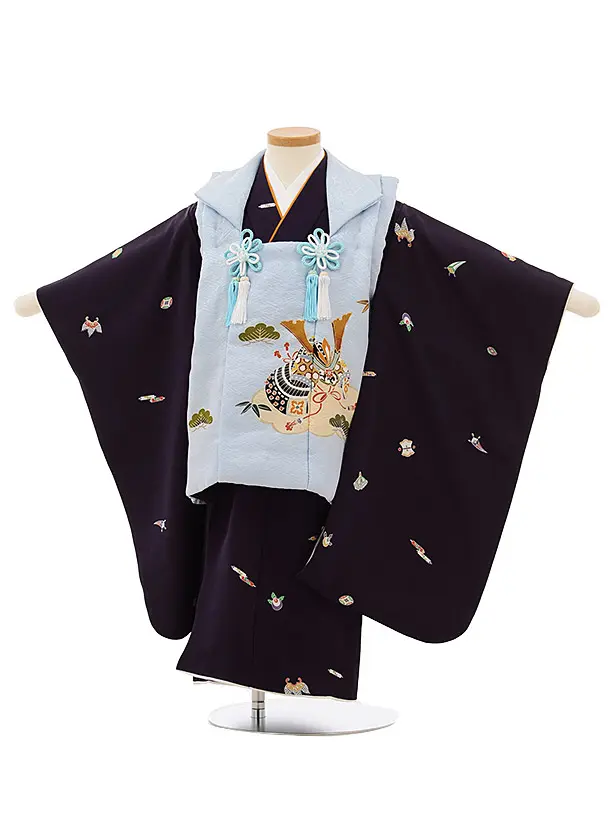 七五三レンタル(3歳男児被布)正絹2587水色兜xパープル宝尽くし