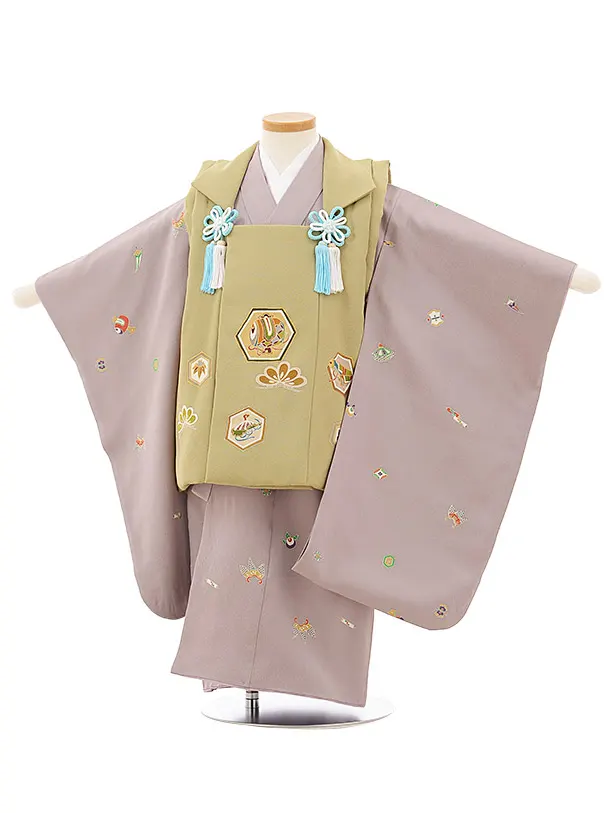 七五三レンタル(3歳男児被布)正絹2590抹茶色亀甲紋x薄パープル 宝尽くし