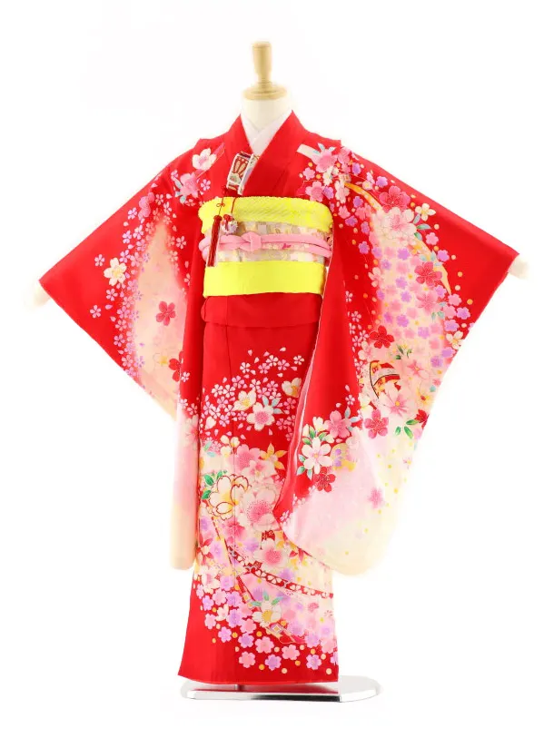 七五三レンタル(7歳女の子袋帯)7582 赤地 桜にまり (正絹)