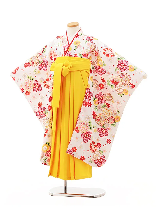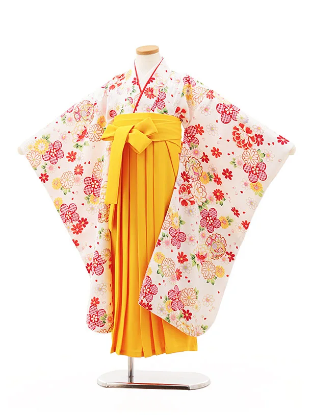 女児袴レンタル(7歳)Y385 白地 赤花×黄色袴