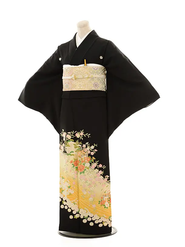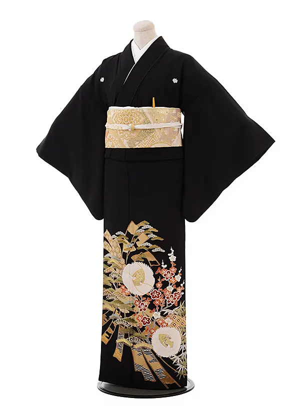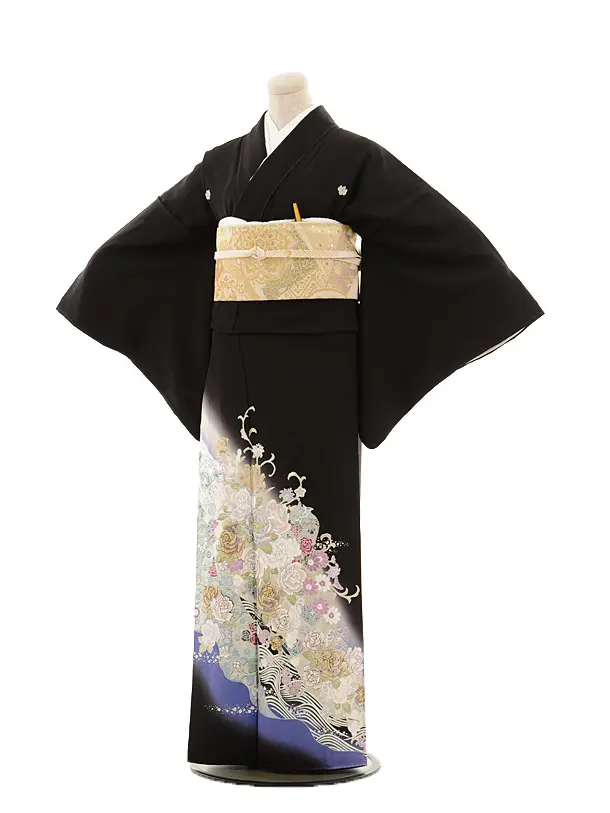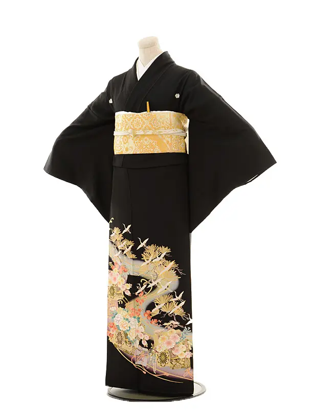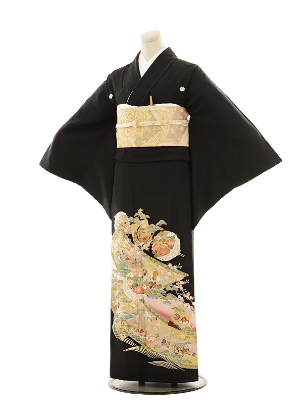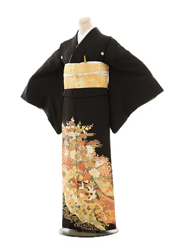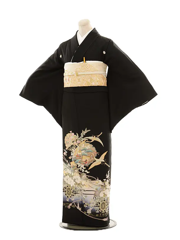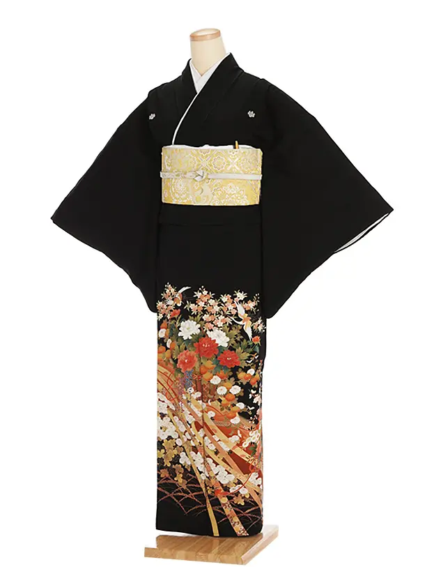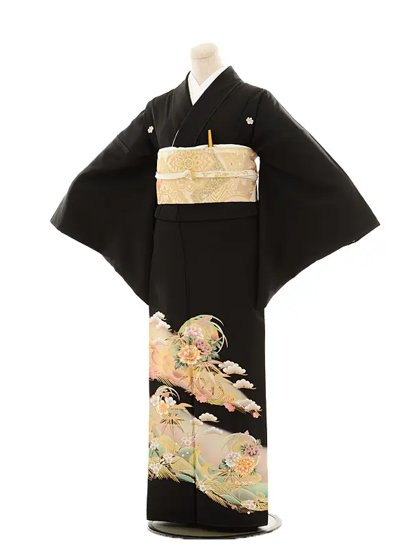 留袖はもっとも格の高い第一礼装で、祝儀のためのフォーマル着物です。 主に結婚式で新郎新婦の母親や仲人の装いになり、黒地の黒留袖には、背中心、両胸、両外袖の5か所に日向紋を染め抜き、裾に華やかな模様が描かれています。