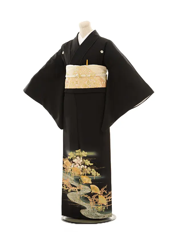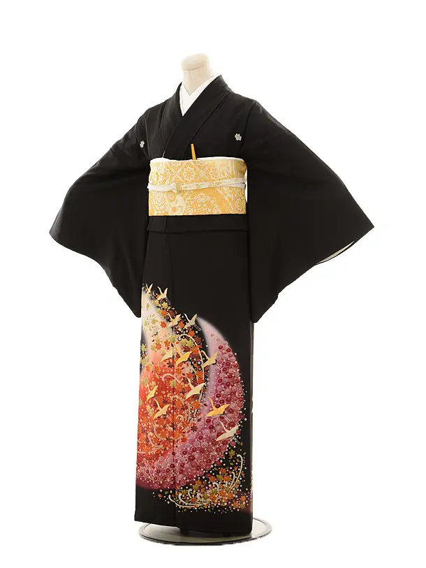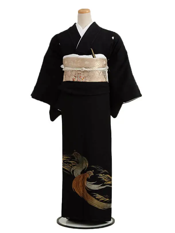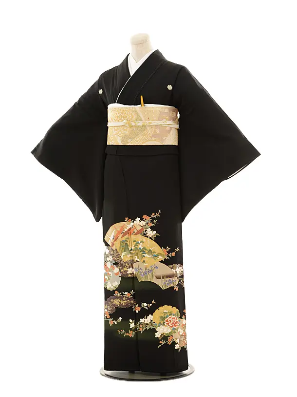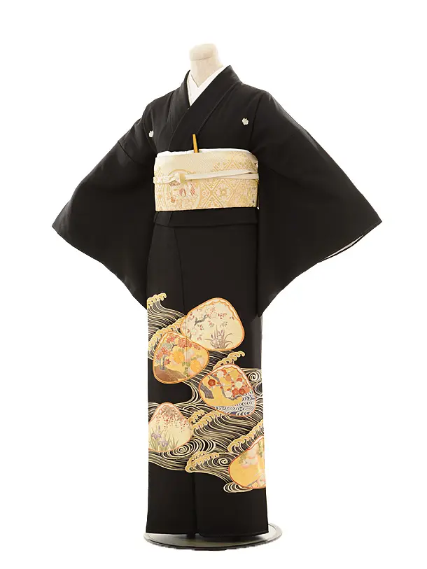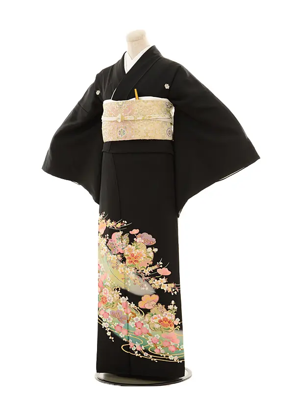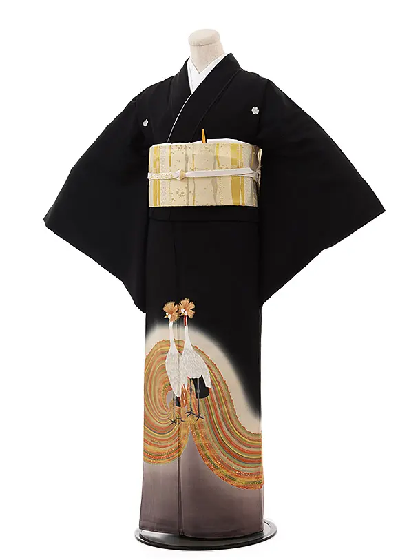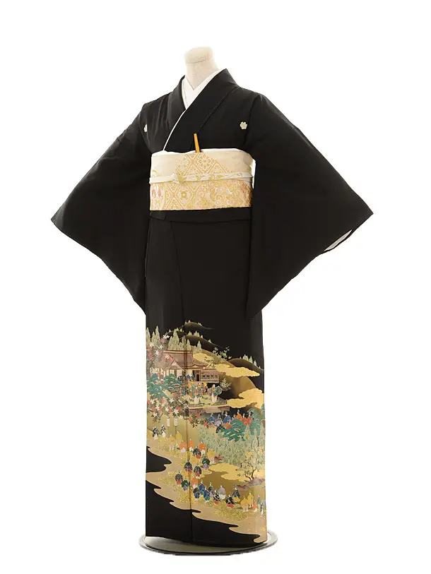 留袖はもっとも格の高い第一礼装で、祝儀のためのフォーマル着物です。 主に結婚式で新郎新婦の母親や仲人の装いになり、黒地の黒留袖には、背中心、両胸、両外袖の5か所に日向紋を染め抜き、裾に華やかな模様が描かれています。