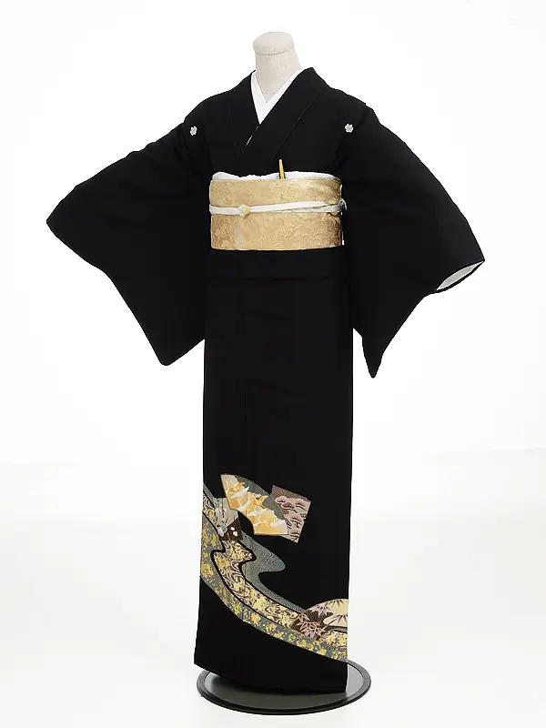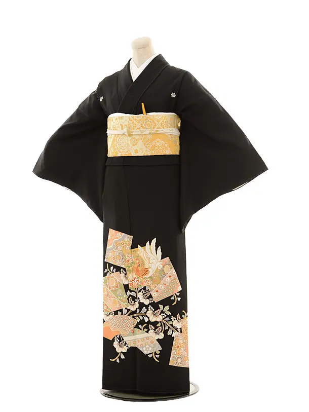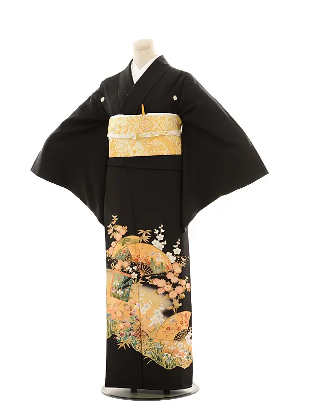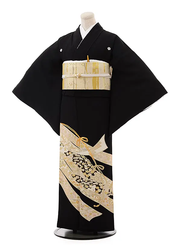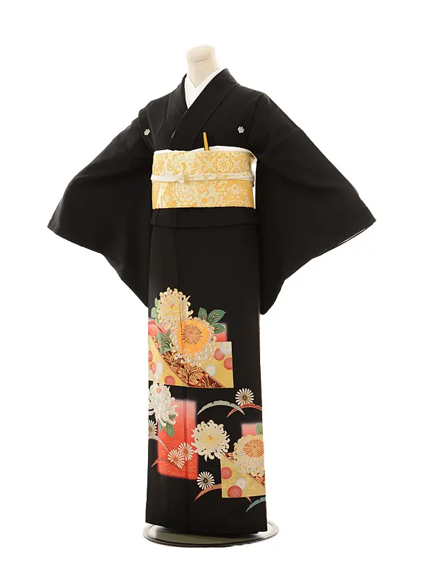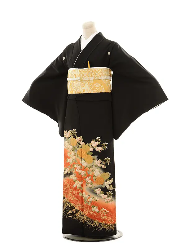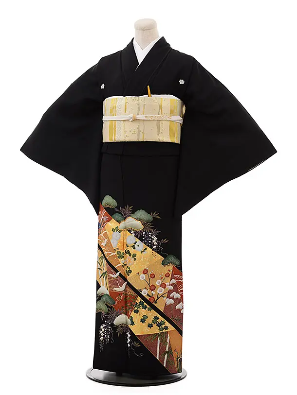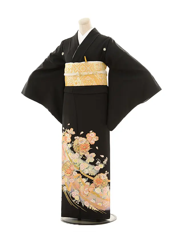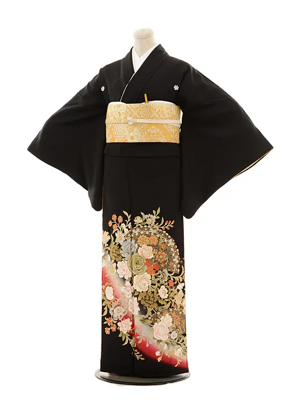 留袖はもっとも格の高い第一礼装で、祝儀のためのフォーマル着物です。 主に結婚式で新郎新婦の母親や仲人の装いになり、黒地の黒留袖には、背中心、両胸、両外袖の5か所に日向紋を染め抜き、裾に華やかな模様が描かれています。