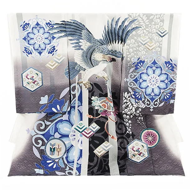 夏用 男児産着 お宮参り 2426 単衣 白地 グレーぼかし 鷹に吉祥文様