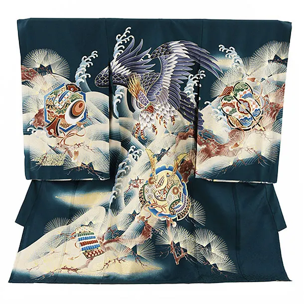 夏用 男児産着 お宮参り 2429 単衣 ブルーグリーン地 鷹に松 兜