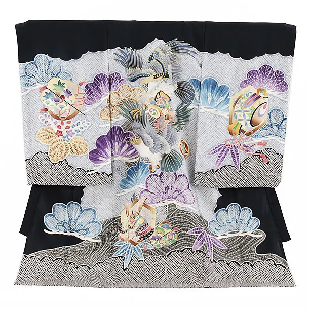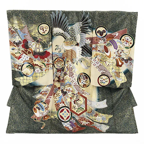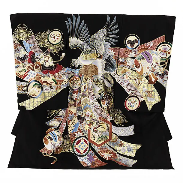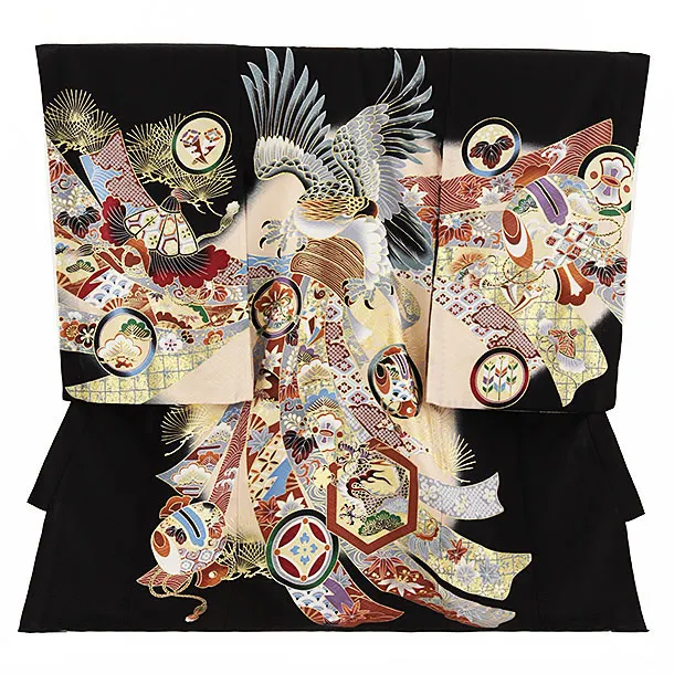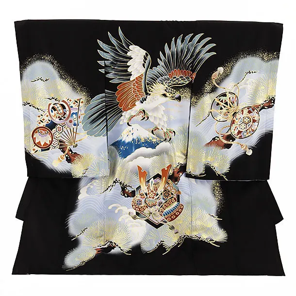 夏用 男児産着 お宮参り 2454 単衣 黒地 鷹に熨斗 吉祥文様