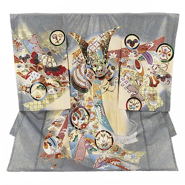 夏用 男児産着 お宮参り 2445 単衣 グレー地 金彩 兜に熨斗