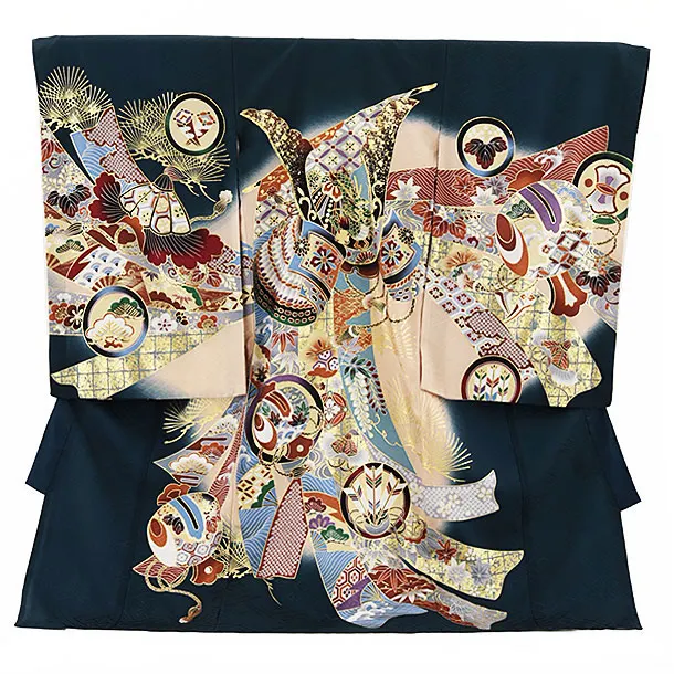 夏用 男児産着 お宮参り 2465 単衣 紺地 兜に扇 鼓