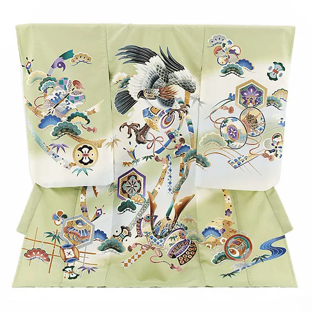 夏用 男児産着 お宮参り 2476 単衣 薄ひわ色 鷹に吉祥文様