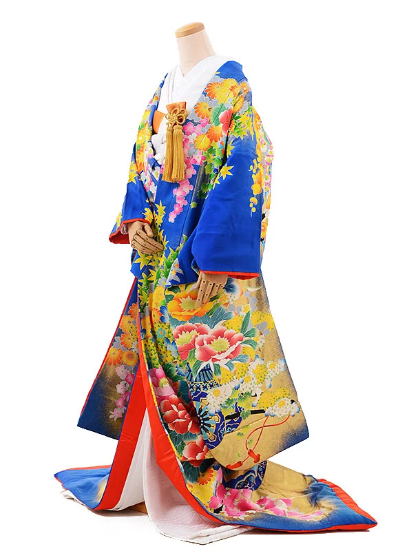 色打掛レンタルE168 手猫友禅 ブルー地 ぼたん 花車