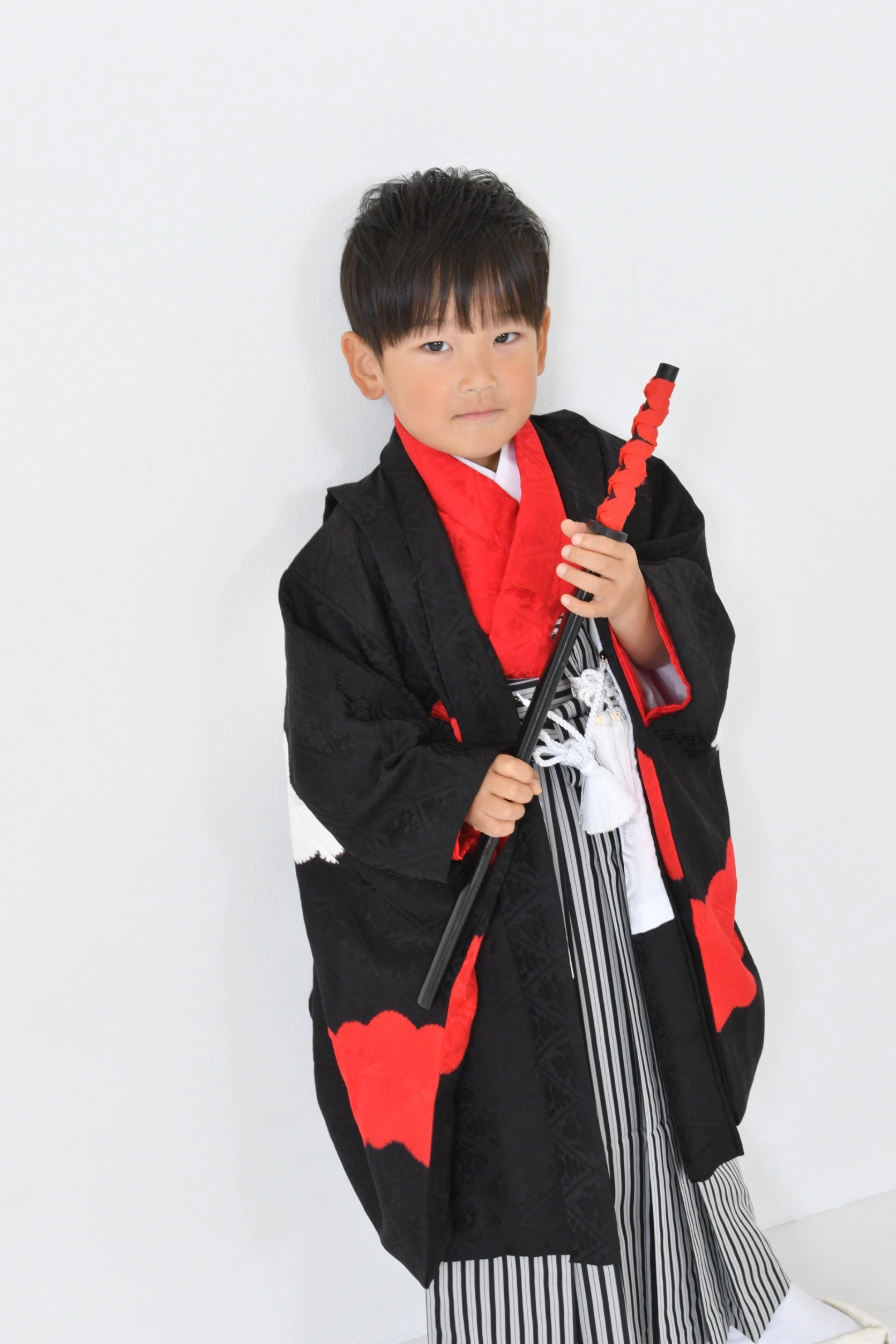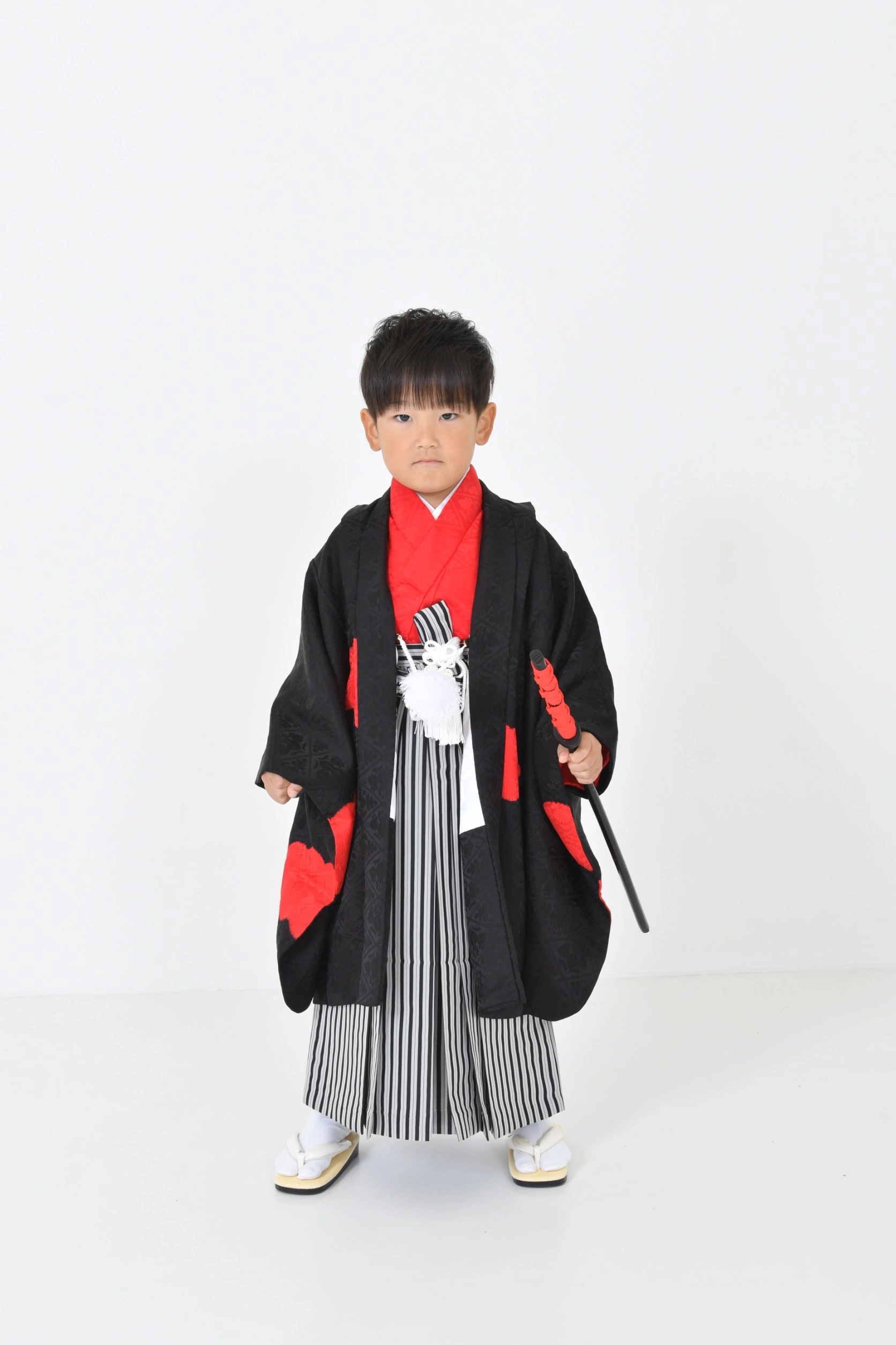 七五三レンタル(5歳男袴)X179【高級正絹】黒地赤雲取りx黒縞袴