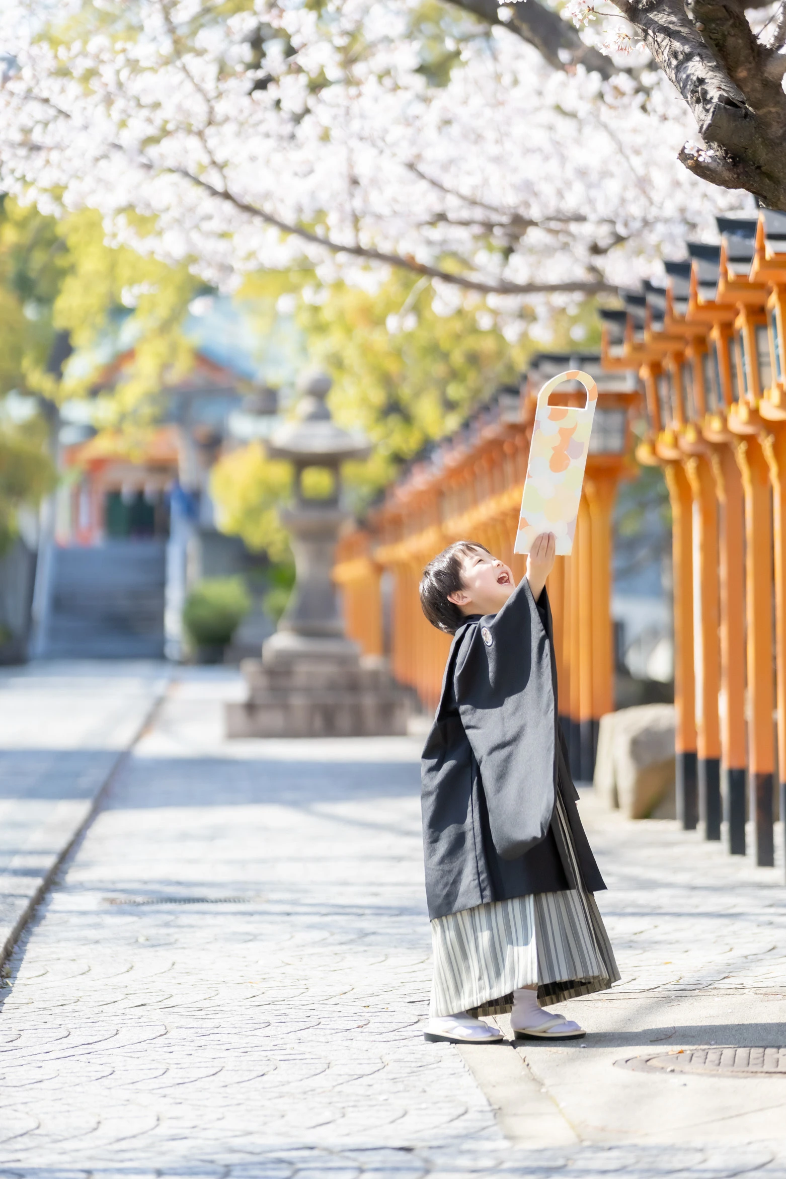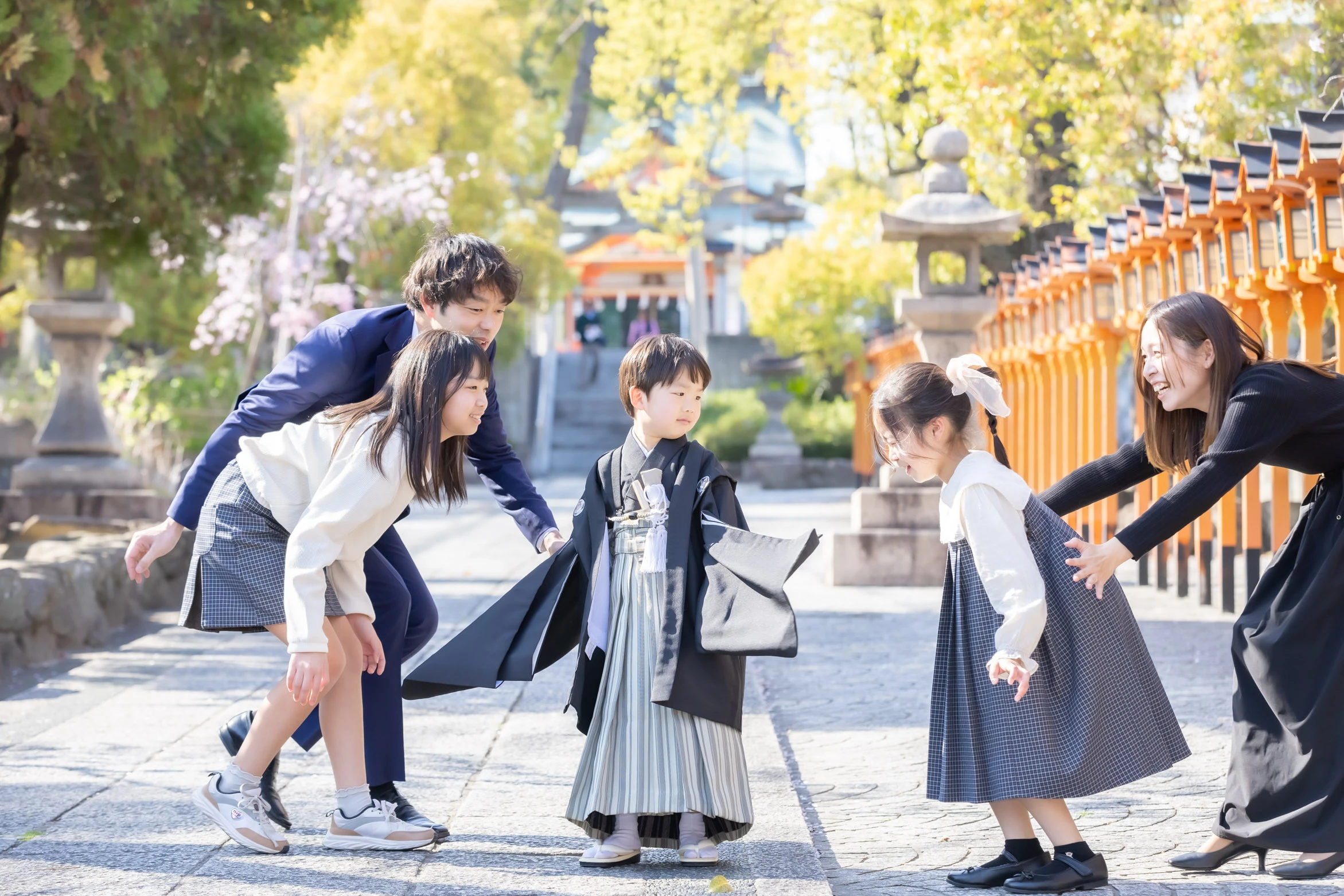 家族みんなに囲まれて、笑顔いっぱいです! 遊びながらの七五三撮影とっても楽しそうです(^^) 可愛いお写真ありがとうございました! こちらの袴はかんたん袴で、誰にでも簡単に着付けできるし、着崩れもないですので とても人気です✨