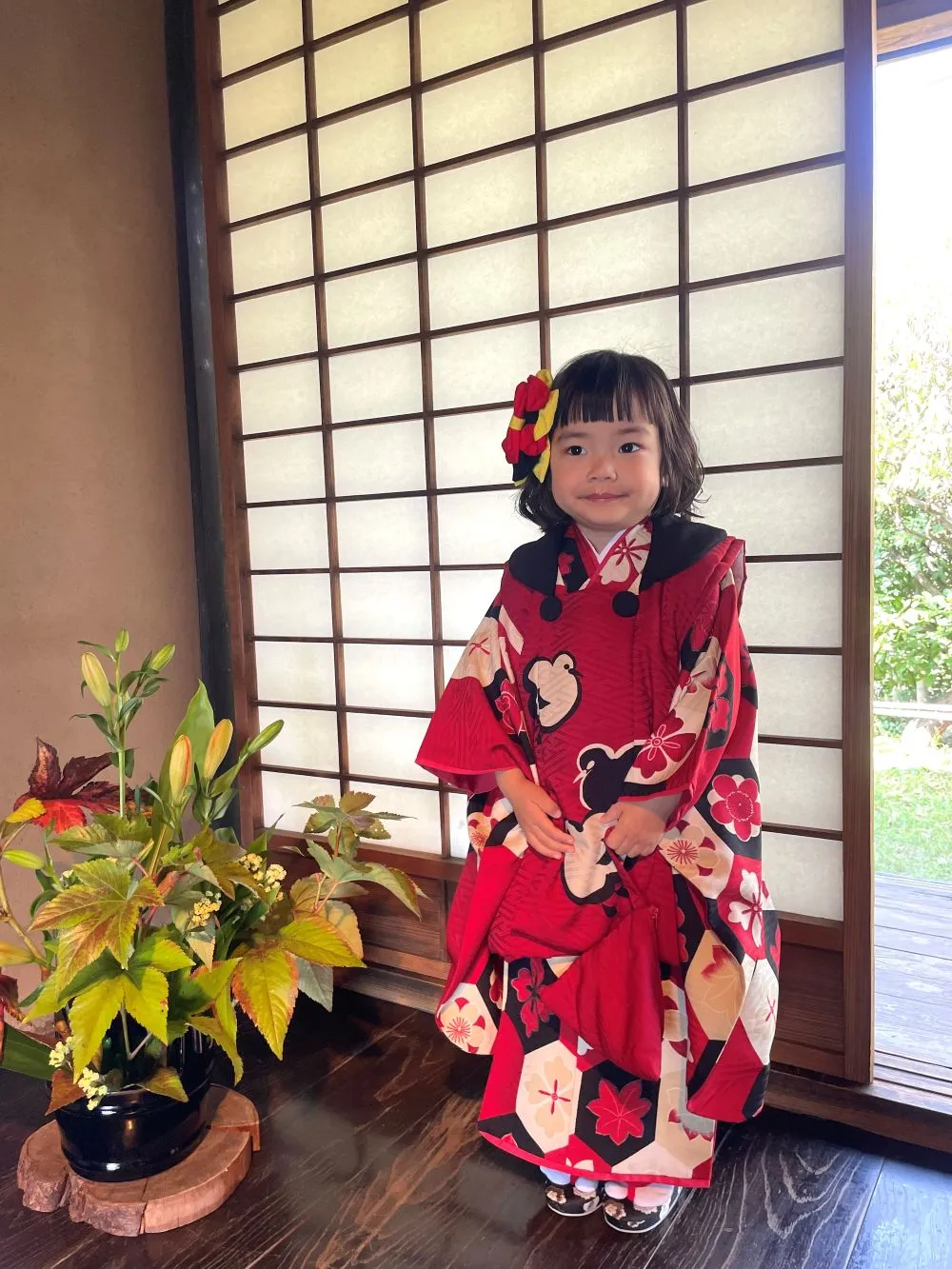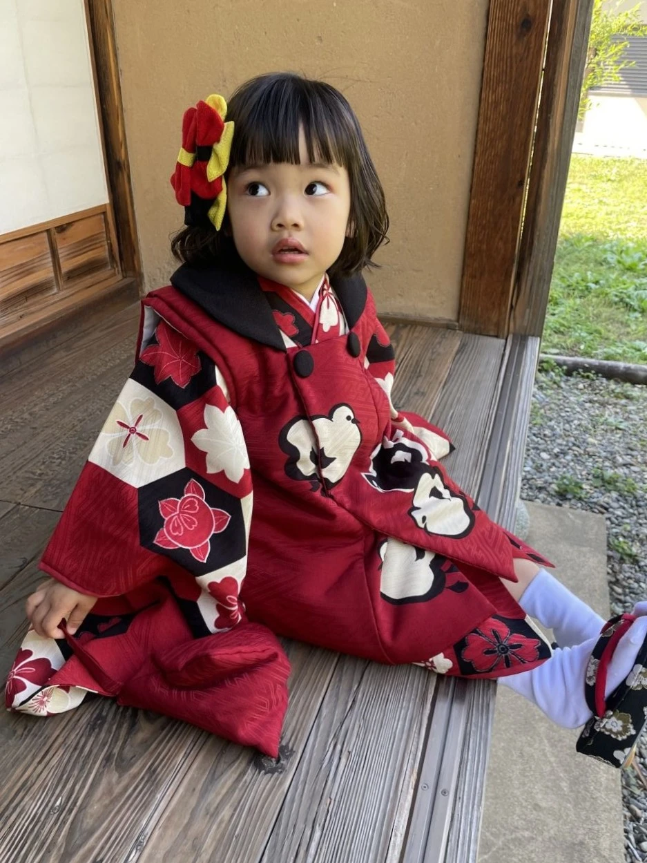 あどけない表情がとってもキュートです! 3歳さんならでは!ですね! モダンアンテナの被布着物も似合ってます♡ 可愛いお写真ありがとうございました!
